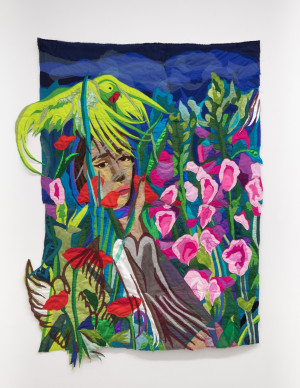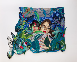 Self-portrait with Tooti Parrot. 2021 – Chiffon, muslin, cotton, polyester, silk, net mesh, suede, color pencil, velvet, and found fabric – 58.5" X 44.5"