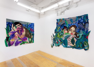 The Lovers I / The Chanting Storks. 2021 – Chiffon muslin, cotton, polyester, silk, acrylic paint, suede, and found fabric – 69" X 78"