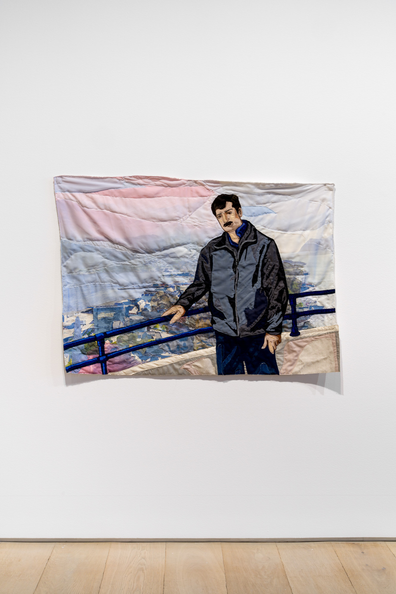 Portrait of a Man in Alesund, Norway. 2025 – Muslin, cotton, canvas, chiffon, silk, denim, suede, color-pencil and acrylic on fabric – 43''H x 60''W