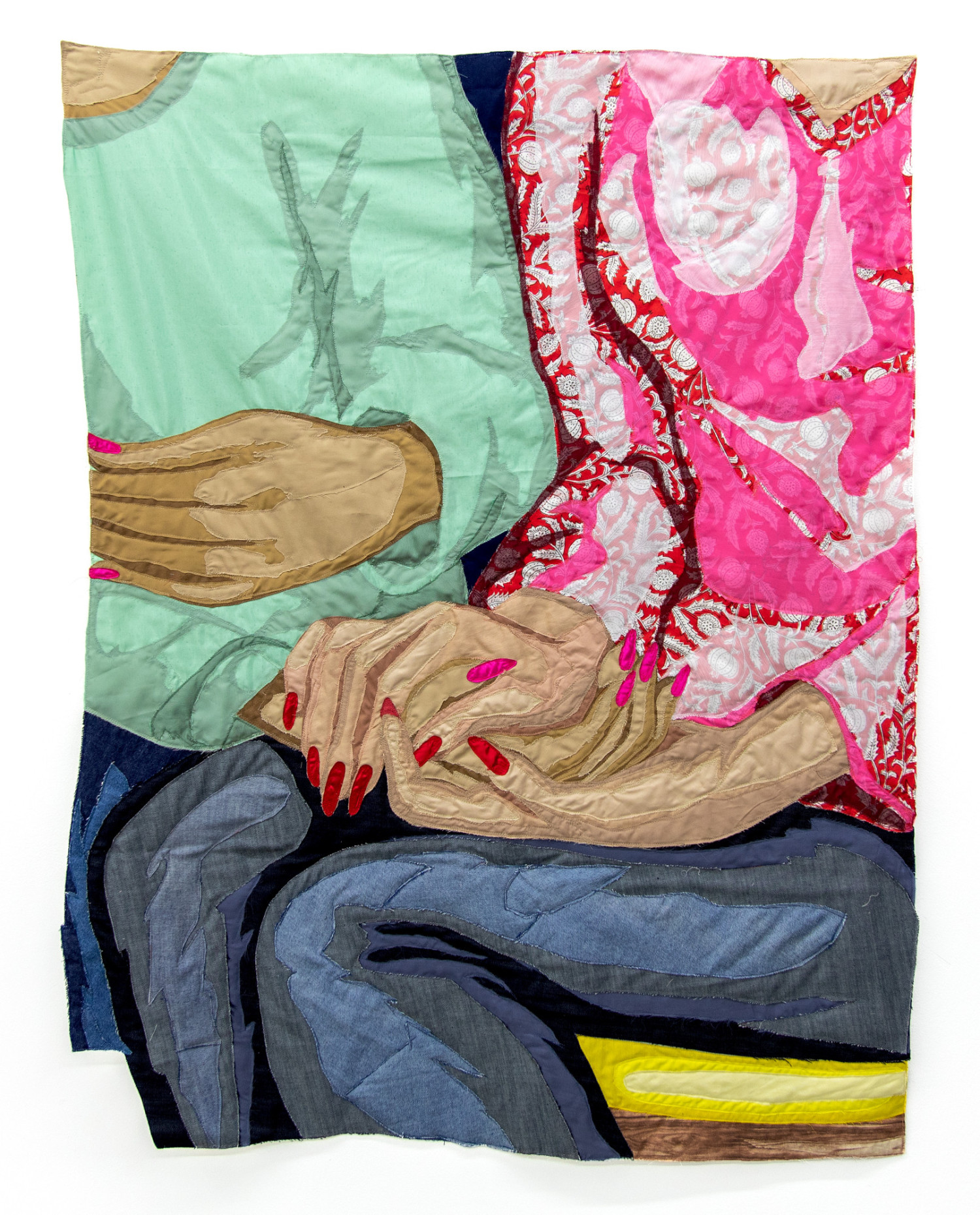 Hold On. 2023 – Muslin, cotton, chiffon, suede, linen, polyester, silk, denim, printed fabric, and gauze fabric – 50” H x 38.5” W