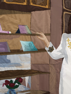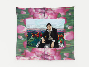 Man with Tulips. 2022 – Muslin, cotton, polyester, dyed fabric, velvet, chiffon, inkjet print on silk-chiffon, silk, and found fabrics – 69” x 77.5”