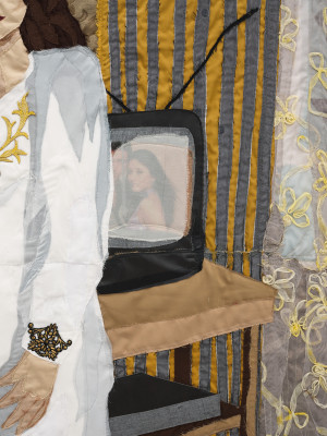 Woman Before A Mirror. 2022 – Muslin, cotton, polyester, dyed fabric, nylon tulle, velvet, chiffon, silk, sued, and found fabrics – 73” x 53.5”