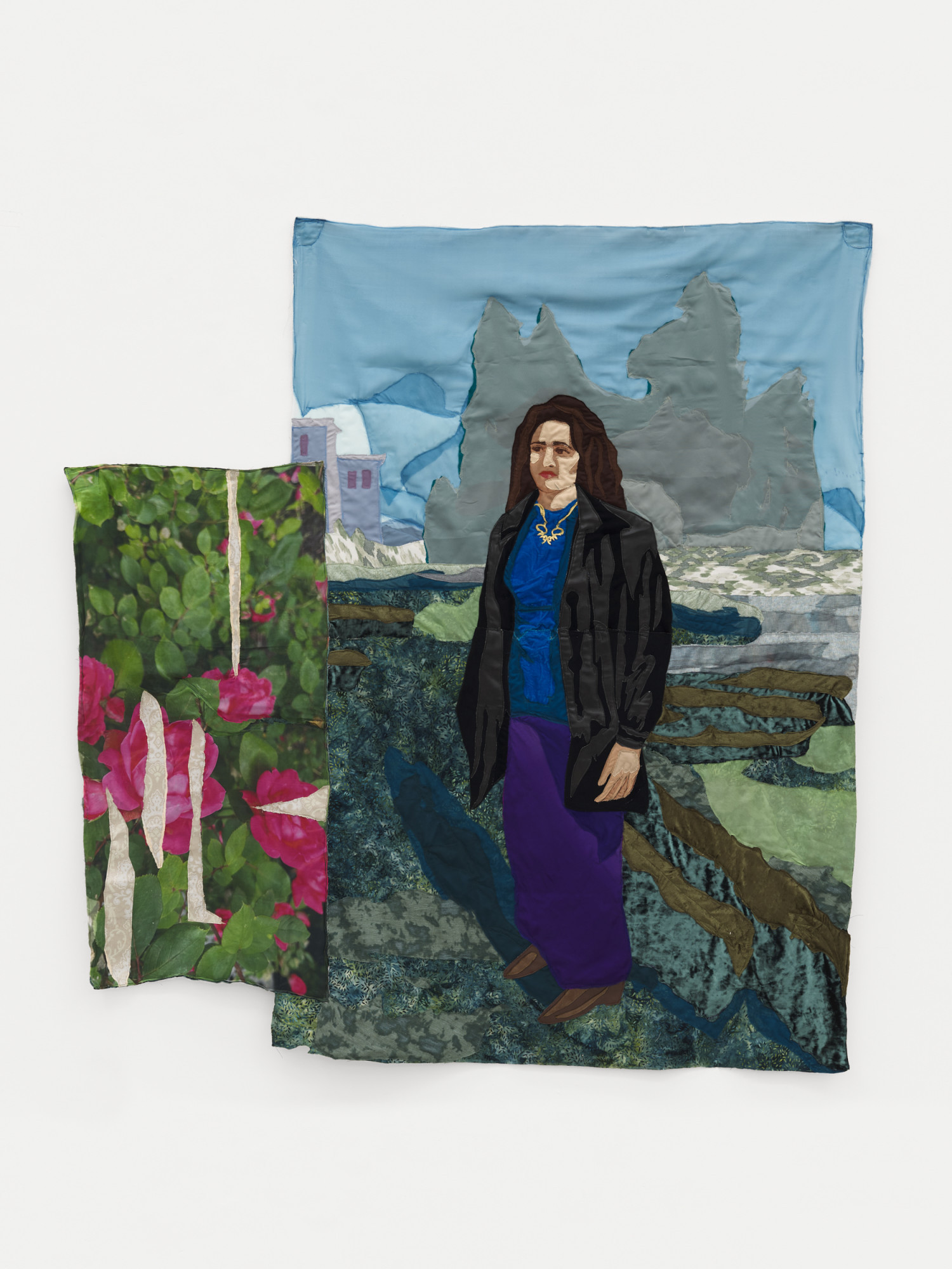 Woman in a Park. 2022 – Muslin, cotton, polyester, dyed fabric, velvet, chiffon, inkjet print on silk-chiffon, silk, wallpaper, leather, embroidery patter, and found fabrics – 65.5” x 60”