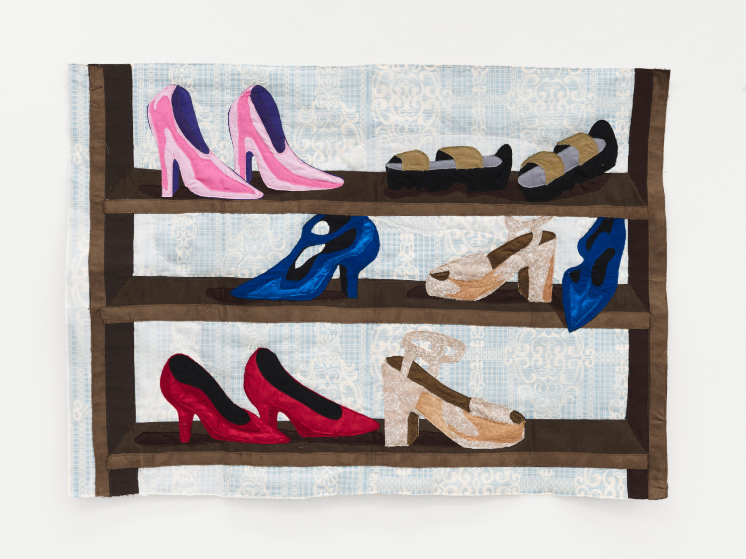 Shoe-rack. 2022 – Muslin, cotton, polyester, velvet, nylon tulle, chiffon, wallpaper, sued, and found fabrics – 31” x 43”