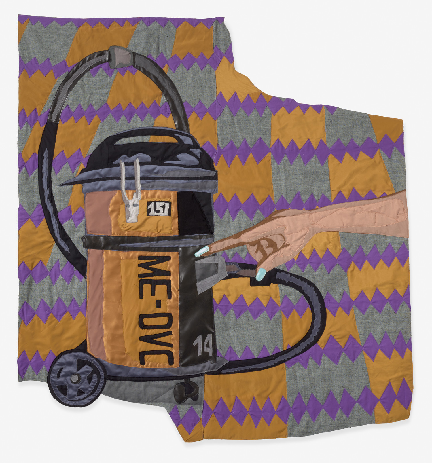 Still-Life with Vacuum Machine. 2023 – Muslin, cotton, polyester, silk, chiffon, leather, Ikat-print fabric and denim – 63”H x 62”W