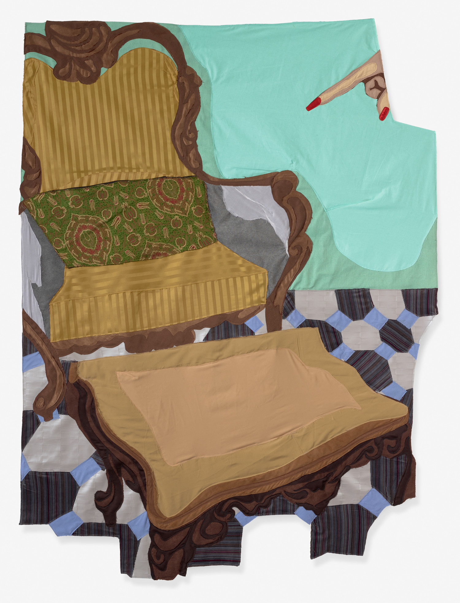 Still-Life with Chair. 2023 – Muslin, cotton, polyester, suede, chiffon, leather, vinyl fabric, and handmade embroidered Persian fabric – 64”H x 49.5”W