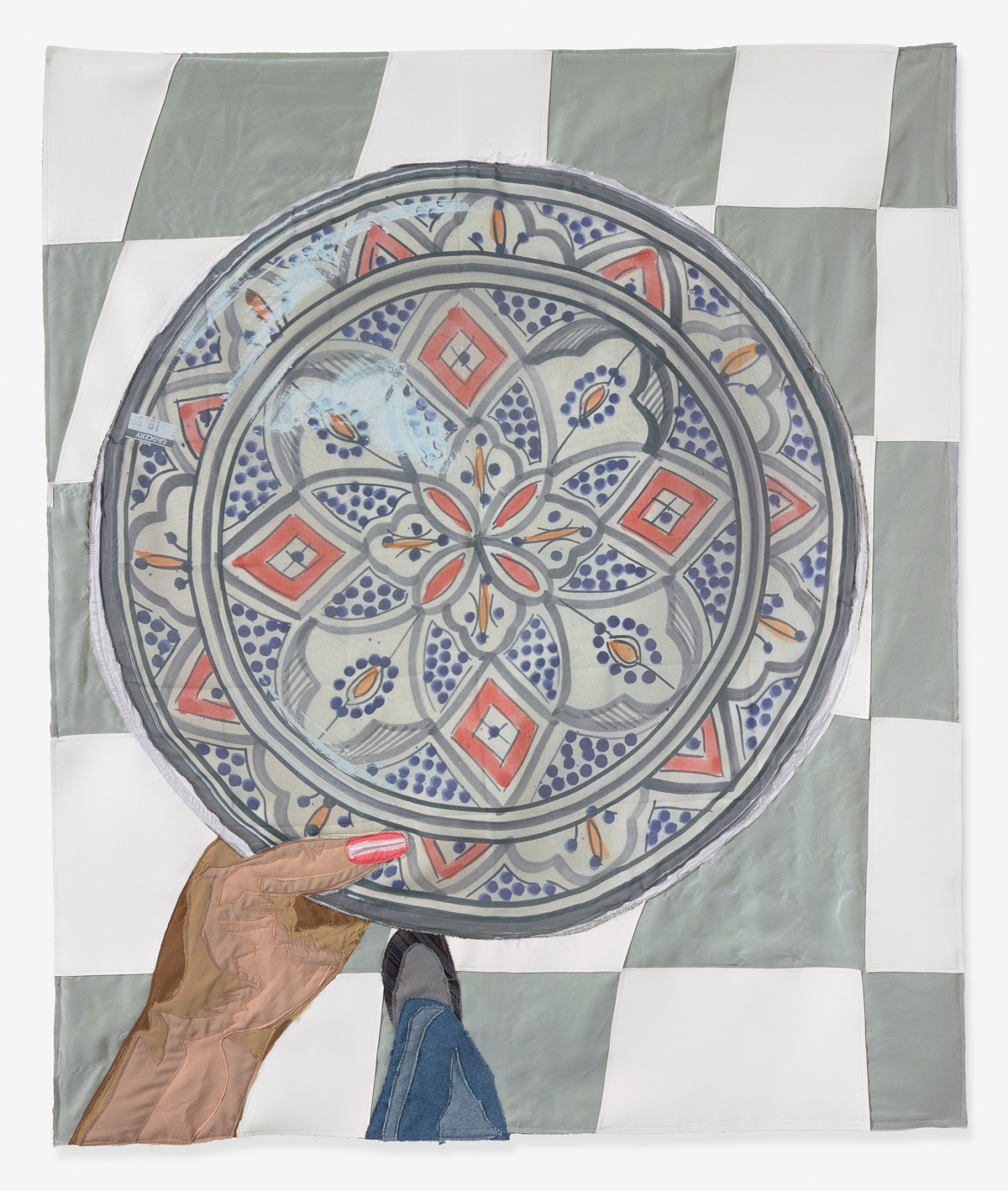 Afghan-Ceramic. 2023 – Muslin, leather, cotton, chiffon, denim, and inkjet-print on silk-chiffon – 42.5”H x 36”W