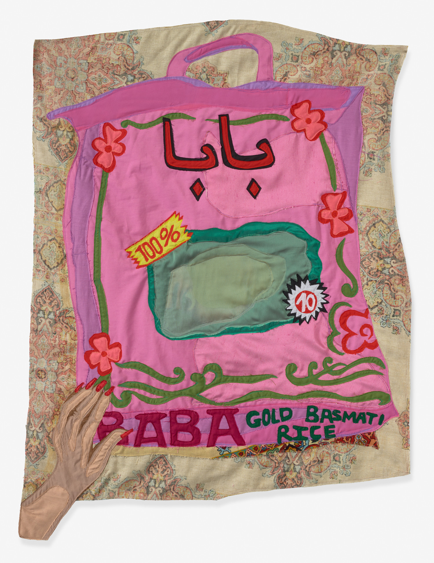 Baba Rice. 2023 – Muslin, polyester, silk, chiffon, inkjet print, and color pencil on fabric – 45.5”H x 33.5”W