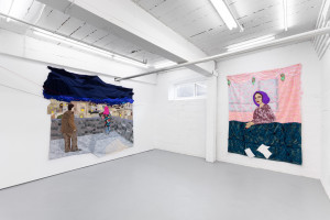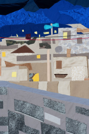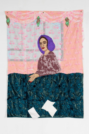 In this exhibition, I am examining how the lifestyles and experiences of those close to me in Afghanistan has changed by using sewn textile fragments to assemble a reality that explores the feelings of in-betweenness, fear, longing, love, guilt, loss, and hope. Each piece weaves together interior and exterior social spaces as a way of showing the nuances of their intimate and urban lives. Whether a young woman is sipping her coffee in a café near the destroyed Buddha’s of Bamiyan or a couple is meeting secretly against their families wishes somewhere in Kabul, I want the expressions of my fictional figures to make viewers pause for a moment to realize, accept, and understand the ongoing political and social upheavals in Afghanistan.