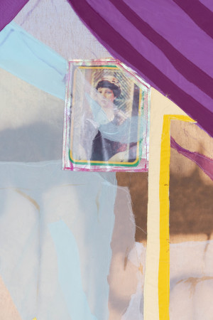 Portrait of Two Lovers (detail). 2021 – Chiffon, muslin, cotton, suede, polyester, silk, printed textile, inkjet print on silk, marker, and found fabric – 61'' x 51.5''