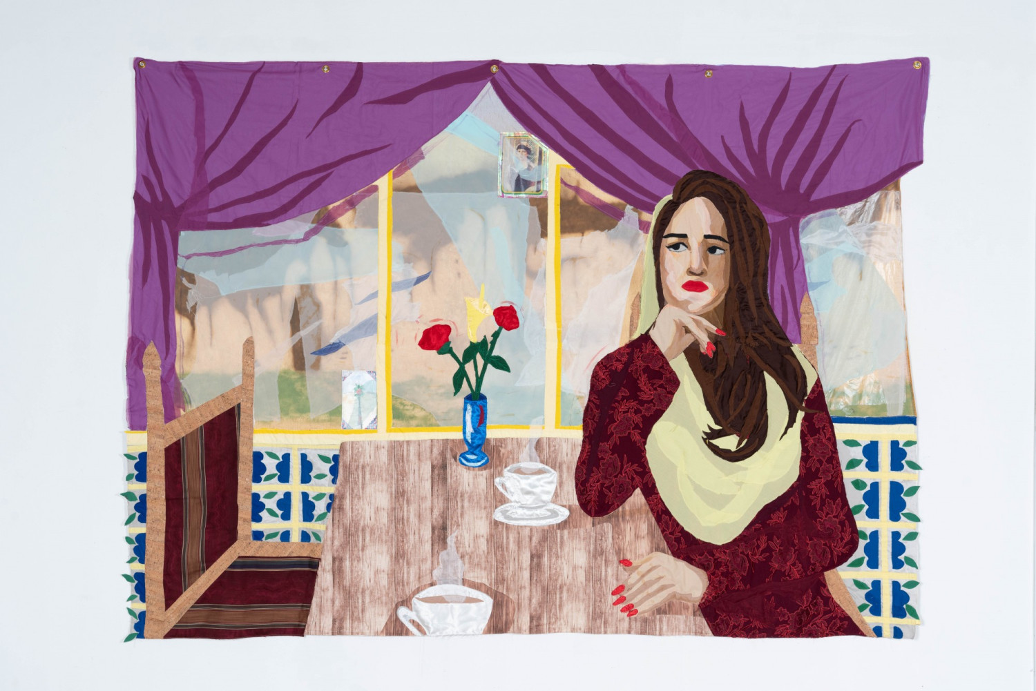 Portrait of a Lady in a Cafe. 2021 – Chiffon, muslin, cotton, polyester, silk, satin, suede, printed textiles, plastic, watercolor on paper, airbrush on fabric, marker, and acrylic on fabric – 79'' x 106''