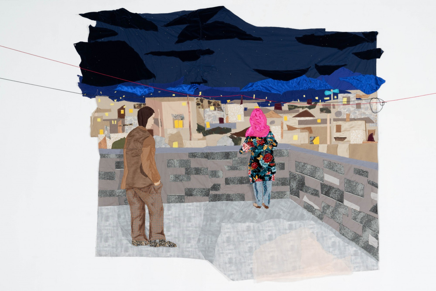 Night Visit. 2021 – Chiffon, muslin, cotton, suede, printed textiles, velvet, satin, polyester, chiffon, rope, acrylic, and marker on fabric – 88'' x 79''