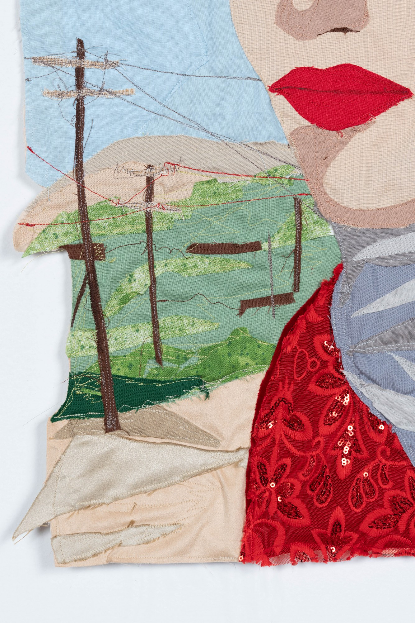 Woman with Red Lipstick (detail). 2021 – Cotton, muslin, polyester, machine embroidered textile, and embroidery on fabric – 24.5'' x 20''