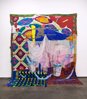 Jannah #1. 2019 – Chiffon, polyester, cotton, gouache paint, brown paper, Afghan embroidered fabric, and found fabric– 120'' x 114''