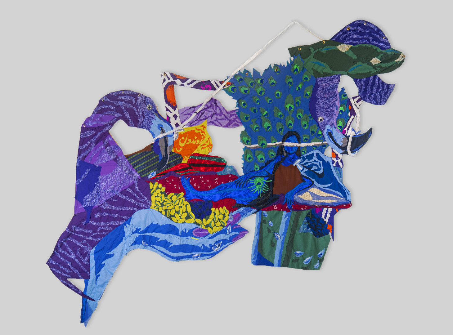 Zhvandun: Life. 2019 – chiffon, cotton, suede, silk, denim, mesh-screen textile, shoelace, hanging wires, bamboo cord, printed paper image, and found fabrics – 146" x 124"
