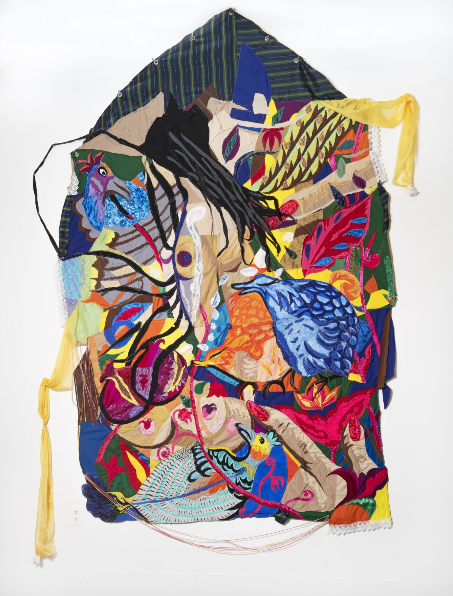 Strangled by your Love. 2019 – chiffon, cotton, suede, silk, denim, mesh-screen textile, shoelace, hanging wires, bamboo cord, printed paper image, and found fabrics – 110" x 72"