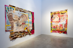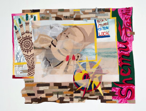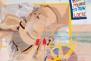 clear vinyl, paper, color pencil, acrylic paint and found fabric – 102” x 69”