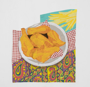 Still life with Fried Chicken and Fries. 2021 – Chiffon, muslin, cotton, polyester, silk, acrylic paint, and found fabric – 45” x 39”