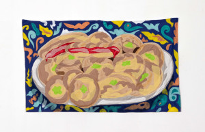 Still life with Kolche Abe-Dandan (Afghan Baked Goods). 2021 – Chiffon, muslin, cotton, polyester, silk, suede, color marker, and acrylic paint – 28” x 47”