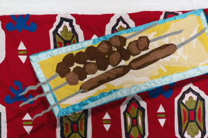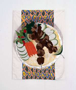 Still life with Kebab and Basmati Rice. 2021 – Chiffon, muslin, cotton, polyester, suede, color pencil, and acrylic paint – 41.5” x 31.5”