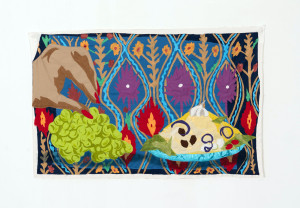 Still Life with Kabuli Pulao and Grapes. 2021 – Muslin, cotton, chiffon, polyester, suede, marker, and acrylic paint – 25” x 40”
