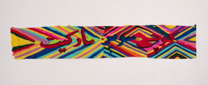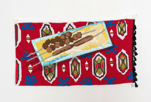 Afghan creamroll. 2021 – Chiffon, muslin, cotton, polyester, suede, marker, acrylic paint and handmade ikat print fabric – 30” x 21”