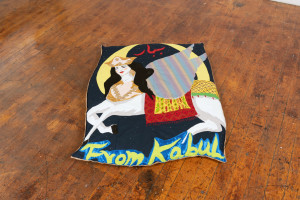 Made in Afghanistan (Rice Sack #2). 2021 – Chiffon, muslin, cotton, polyester, silk, faux leather, acrylic paint, burlap, and found fabric – 43” x 32” x 3.5”