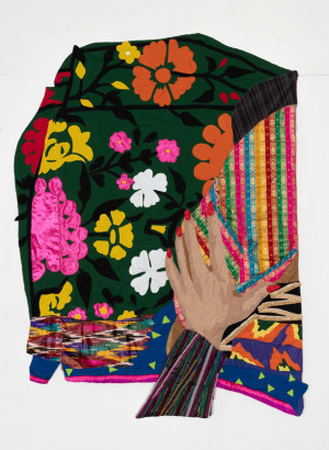 Self-portrait with Afghan Suzani Textile. 2021 – Muslin, cotton, polyester, Afghan textile, silk, handmade ikat print, and found fabric – 72” x 54”