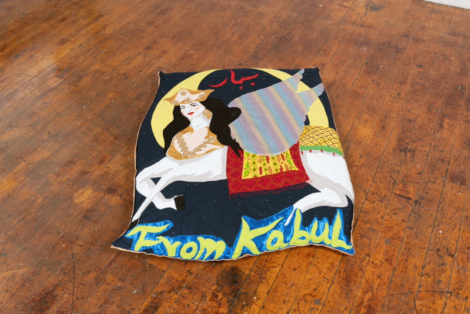 Bahar, From Kabul (Rice Sack #1). 2021 – Chiffon, muslin, cotton, polyester, silk, faux leather, acrylic paint, burlap, and found fabric – 43” x 34” x 3.5”