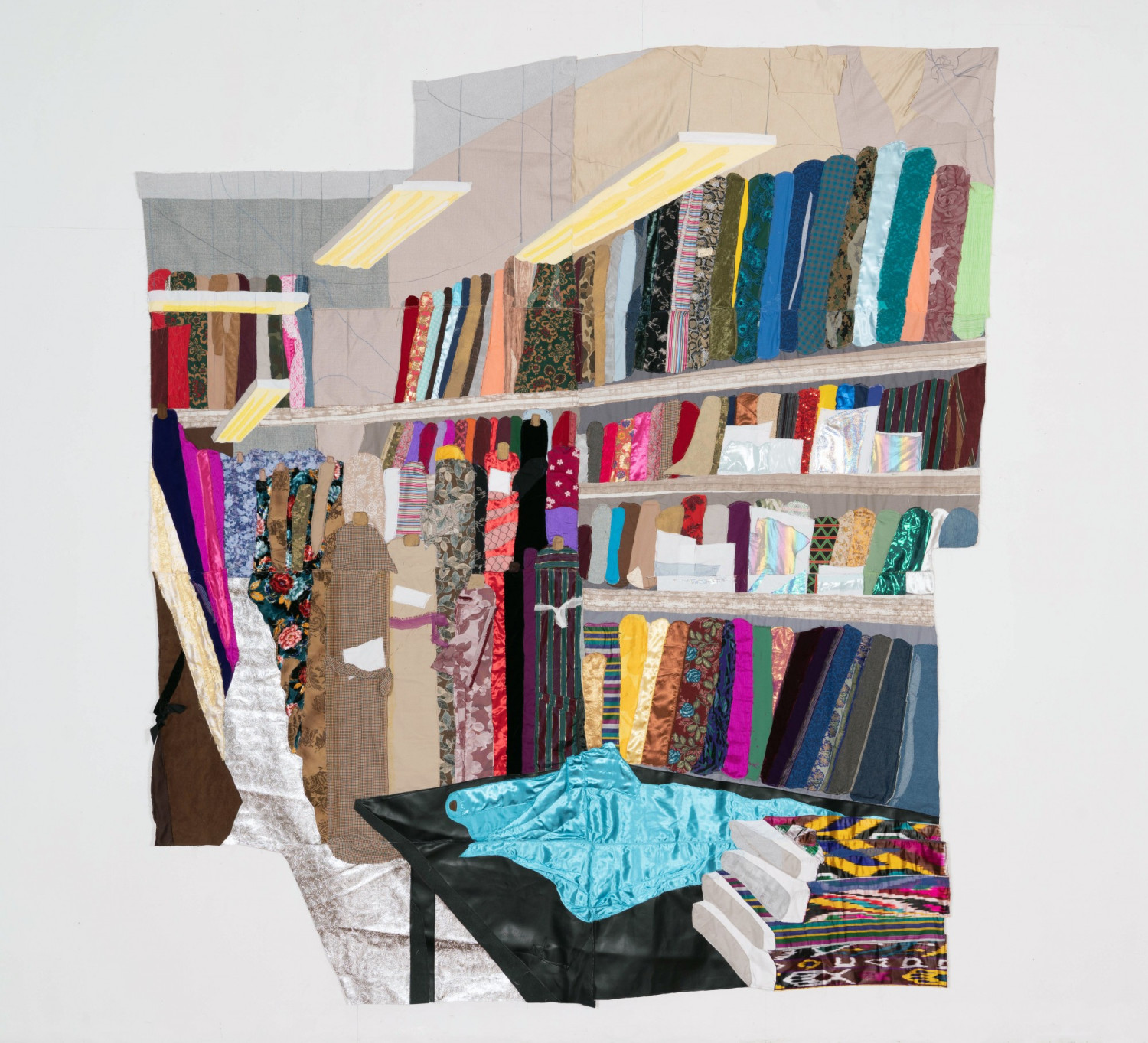 A.K. Fabric Shop. 2021 – Chiffon, silk, satin, muslin, cotton, lace, polyester, suede, paper, iridescent paper, denim, ikat printed fabric, faux leather, color pencil on fabric, velvet, camouflage, and found fabric – 113” x 99”