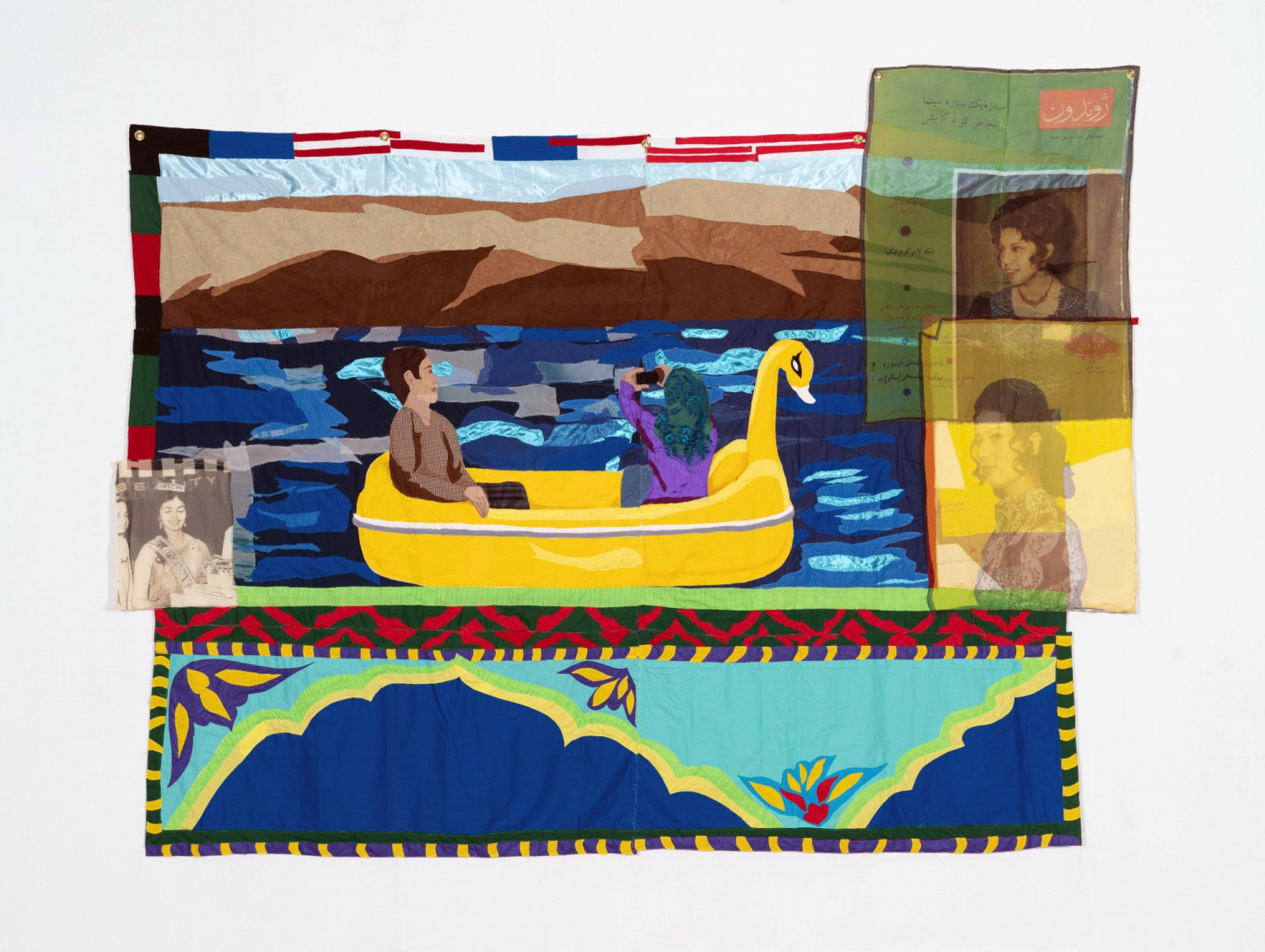 Couple Sightseeing. 2021 – Chiffon, muslin, cotton, polyester, silk, inkjet print on chiffon, suede, color pencil, and found fabric – 87” x 114”