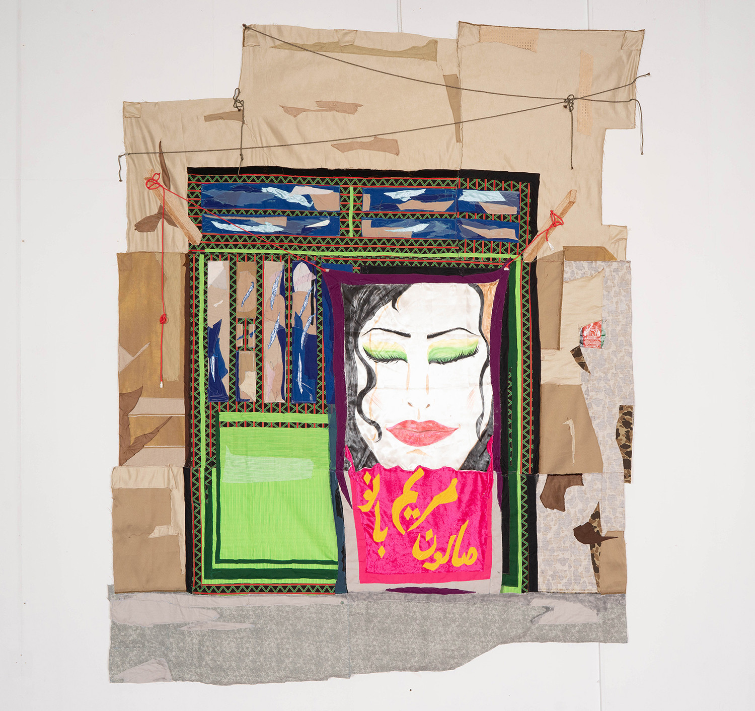 Madam, Mariam Beauty Salon. 2020 – cotton, chiffon, muslin, silk, suede, shoelaces, camouflage fabric, inkjet prints on paper, marker, polyester, and found fabric – 111" x 87"
