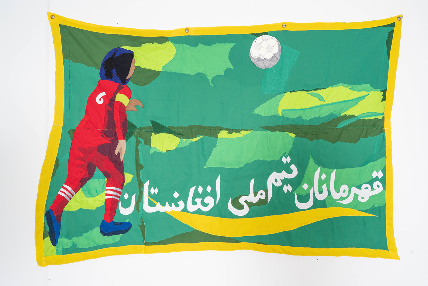 The National Championship Team of Afghanistan. 2020 – cotton, chiffon, muslin, suede, and faux leather – 60" x 85"
